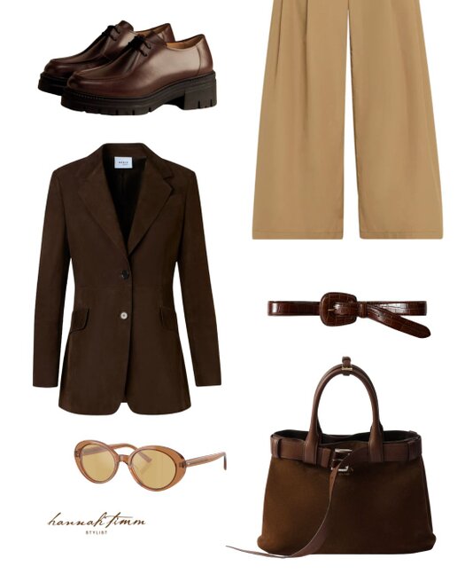 Think blazers, trousers, and leather accessories that feel timeless yet perfectly on-trend. When thrifting, check for jackets (both men’s and women’s section), coats, trousers, belts, and bags first, and don’t forget shoes, especially boots and loafers. Try layering different shades together for a monochrome effect, or pair brown with unexpected colors like powder blue, soft pink, or yellow for a fresh, modern twist.