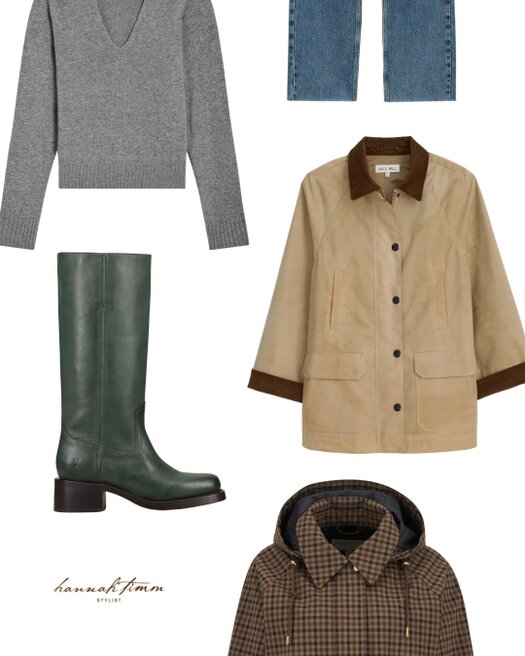 This season’s preppy revival nods to classic New England style. Think timeless, polished, and a little rugged. Look for wool coats, cashmere knits, barn jackets, plaid layers, denim jackets, and straight-leg jeans. Rain boots and riding boots add practicality, while vintage-style bags tie it all together.
